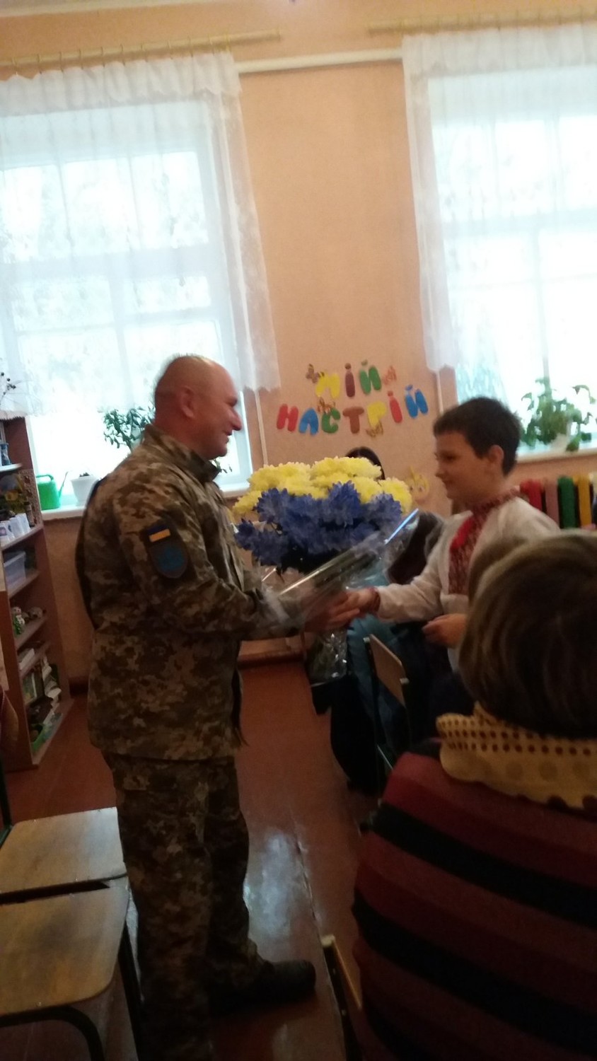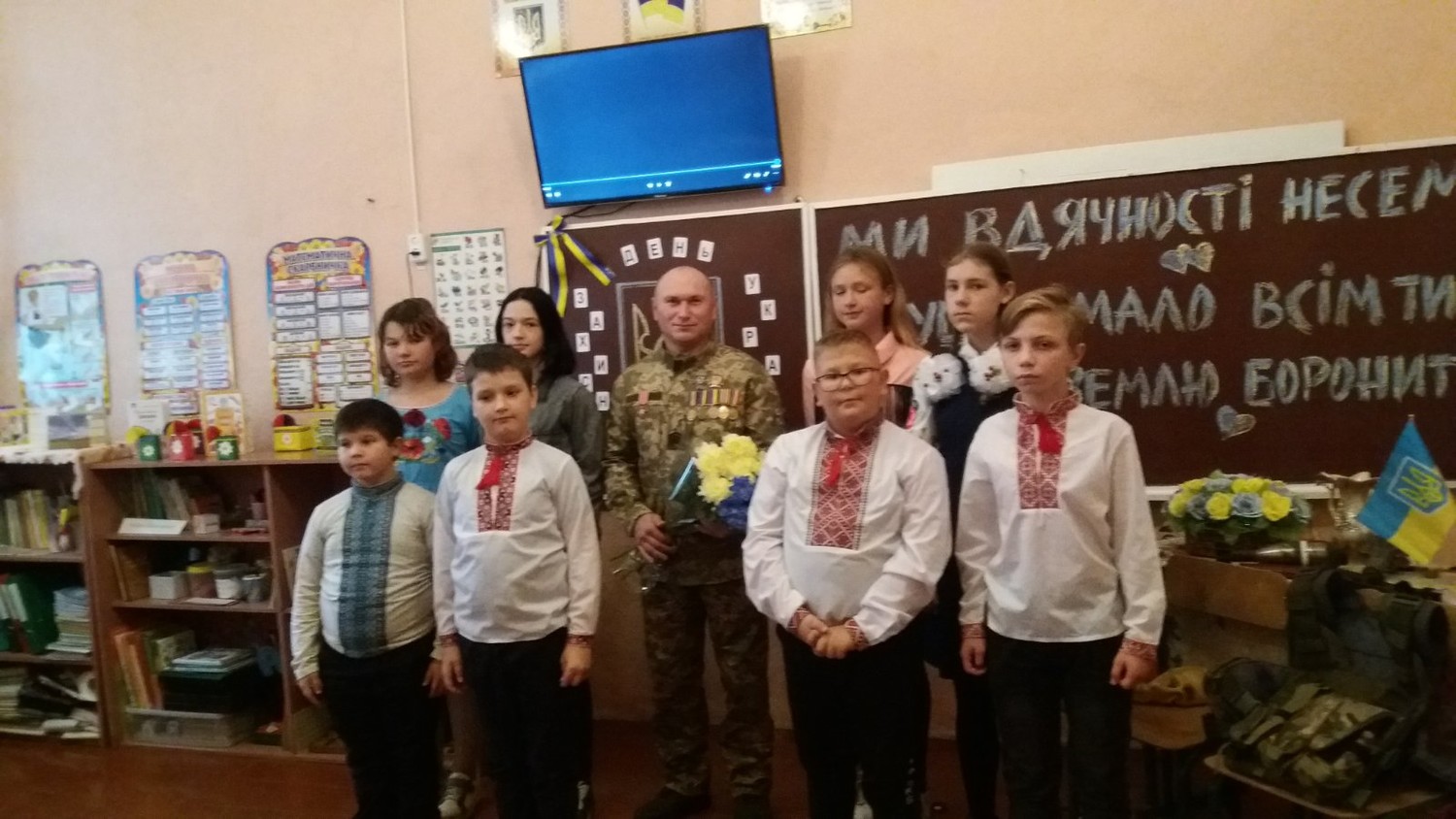 На заході був присутнім учасник ООС, колишній учень закладу Рева Валерій Миколайович. Учні захоплено слухали розповідь учасника військових дій на Сході, читали вірші, співали пісні на патріотичну тематику.